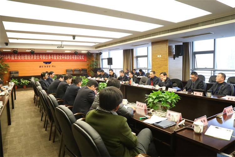 2018年1月3日上午,2018年度職業(yè)經(jīng)理經(jīng)濟(jì)責(zé)任考核任務(wù)書暨安全環(huán)保責(zé)任書簽訂儀式在閏土大廈舉行。阮靜波董事長、徐萬??偨?jīng)理等高層領(lǐng)導(dǎo)與各職業(yè)經(jīng)理齊聚一堂,為做好公司新一年度的安全環(huán)保工作謀篇布局。
