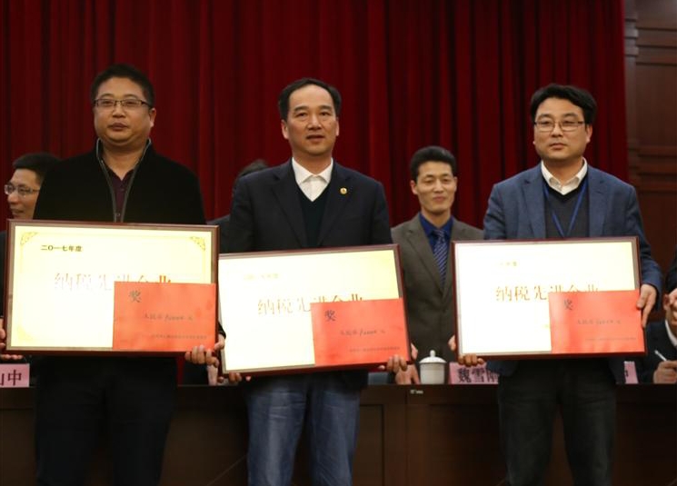 閏土新材料公司董事長周杰文、迪邦公司總經(jīng)理陳曉棟分別領(lǐng)取“納稅先進企業(yè)”獎項